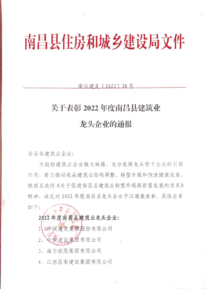 为着力培育南昌县建筑业龙头骨干企业,树立典型,9日,我县住房和城乡建设局印发了《关于表彰2022年度南昌县建筑业龙头企业的通报》,昌建集团被授予“2022年度南昌县建筑业龙头企业”荣誉称号!