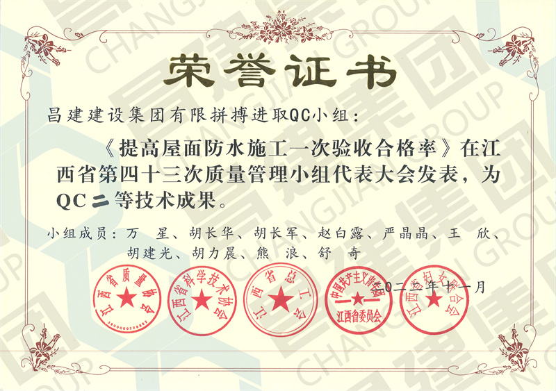 12月13日,江西省第四十三次质量管理小组代表大会在江西省景德镇顺利召开。昌建集团“拼搏进取”QC小组选送的《提高屋面防水施工一次验收合格率》课题获评“QC二等技术成果”荣誉称号。